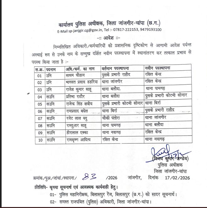 जांजगीर-चांपा में पुलिसिंग मजबूत करने 10 पुलिसकर्मियों का तबादला, एसपी विजय पांडेय ने जारी किया आदेश