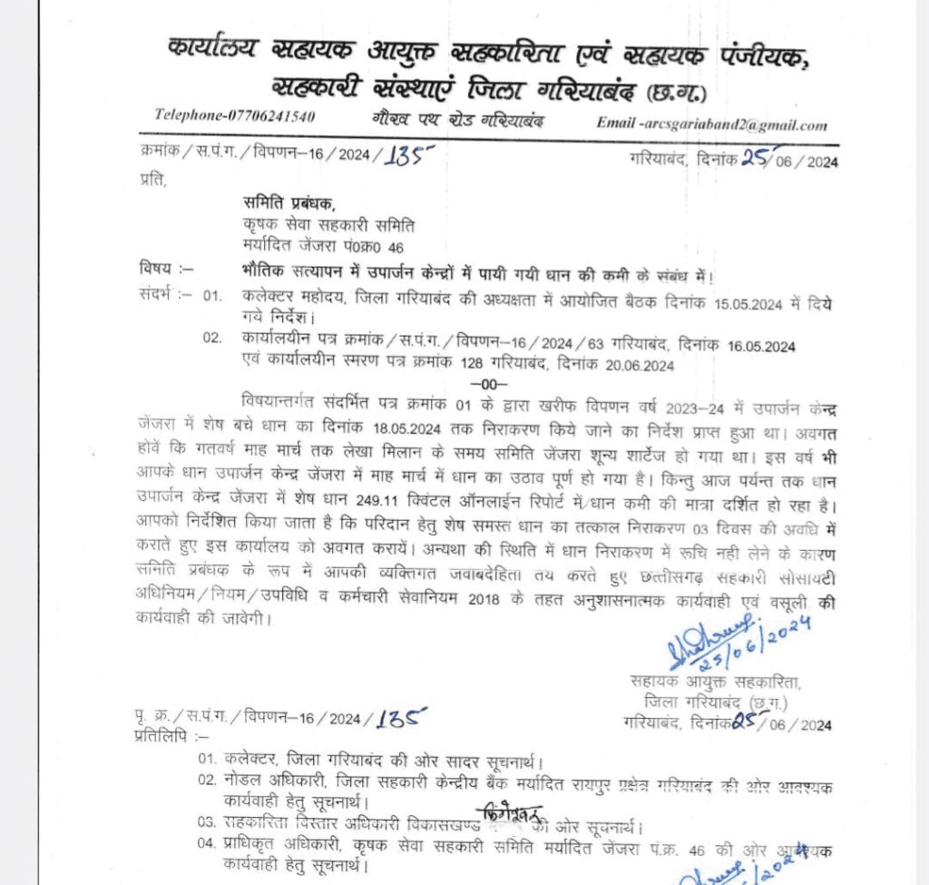 इस मामले में कार्यालय सहायक आयुक्त एवं सहायक पंजीयक गरियाबंद द्वारा समिति प्रबंधक को नोटिस जारी किया गया है। नोटिस में समिति प्रबंधक से तीन दिन के अंदर जवाब मांगा गया है। यदि समय सीमा के अंदर जवाब नहीं दिया गया, तो उनके खिलाफ कार्रवाई की जाएगी।