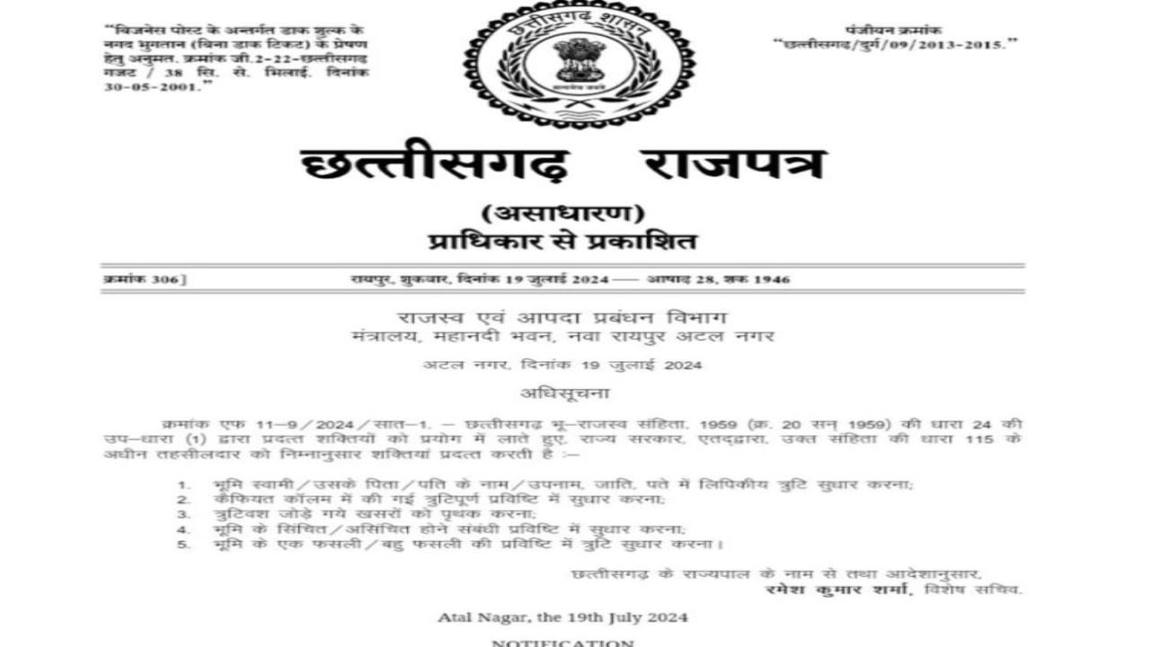रायपुर: छत्तीसगढ़ सरकार ने राज्य के भू-स्वामियों को बड़ी राहत देते हुए एक महत्वपूर्ण निर्णय लिया है। अब भू-स्वामियों को पटवारी रिकॉर्ड में दर्ज त्रुटियों के सुधार के लिए अधिकारियों के चक्कर नहीं लगाने पड़ेंगे। राजस्व मंत्री टंक राम वर्मा की पहल पर राजस्व विभाग ने तहसीलदारों को यह अधिकार दे दिया है।