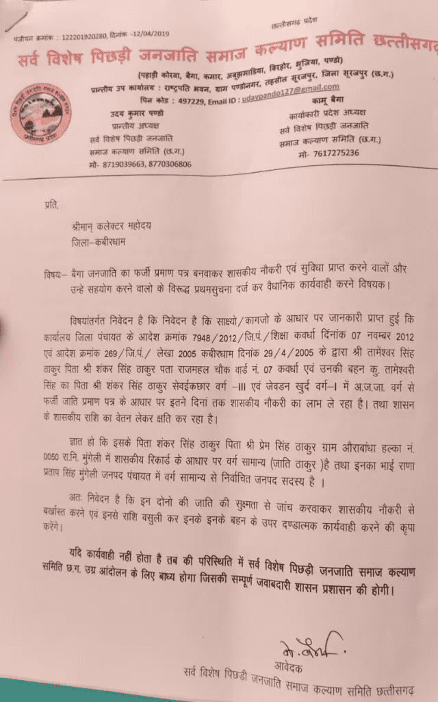 कवर्धा। जिले में सामान्य वर्ग के दो शिक्षकों द्वारा फर्जी अनुसूचित जनजाति प्रमाणपत्र बनाकर सरकारी नौकरी हासिल करने का मामला सामने आने के बाद आदिवासी समाज में रोष व्याप्त है। इस अन्याय के विरोध में गुरुवार को आदिवासी समाज के प्रतिनिधि और सामाजिक पदाधिकारी कलेक्ट्रेट पहुंचे और कलेक्टर को ज्ञापन सौंपा। उन्होंने दोषी शिक्षकों पर कड़ी से कड़ी कार्रवाई की मांग की।