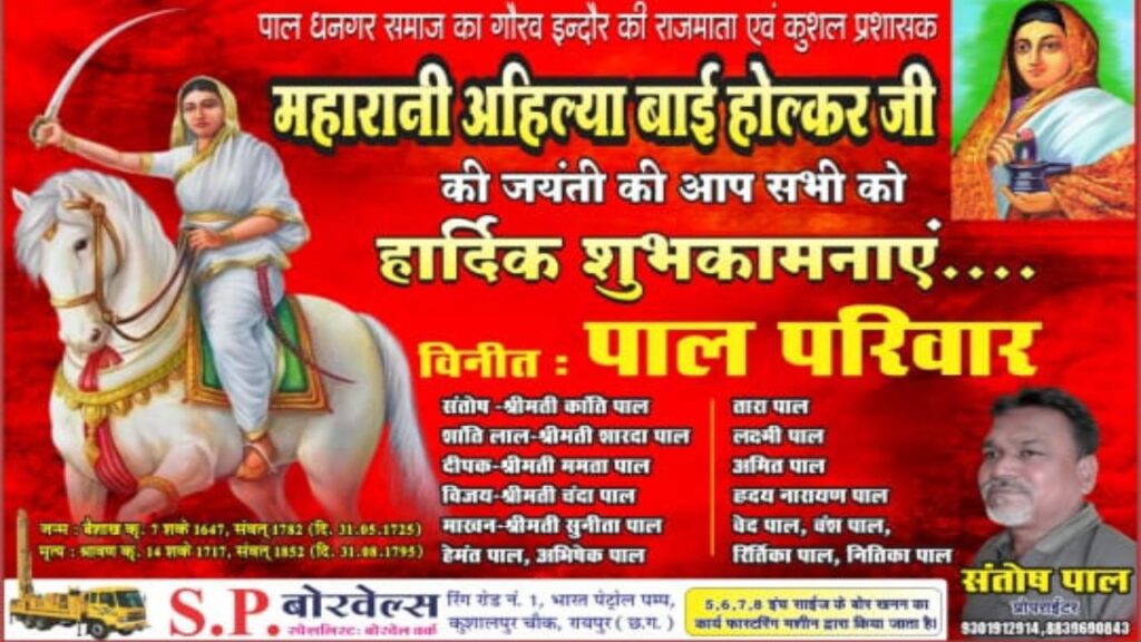 राजधानी रायपुर में निखर गडारिया पाल समाज द्वारा रानी अहिल्या बाई होल्कर जयंती मनाई गई। इस मौके पर महादेव घाट रायपुर चौक पर भीषण गर्मी को देखते हुए संजय पाल के पाल परिवार ने शरबत बांटने का कार्यक्रम आयोजित किया। इस कार्यक्रम में निखर गडारिया समाज ने बढ़-चढ़कर हिस्सा लिया।
