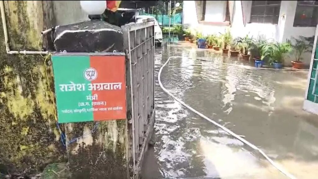 गांधी चौक स्थित प्रदेश के नए मंत्री राजेश अग्रवाल के शासकीय आवास में बारिश का पानी लबालब भर गया। नगर निगम की टीम ने तुरंत मोटर पंप लगाकर पानी निकालने का काम शुरू किया। इस घटना ने शहर के ड्रेनेज सिस्टम की खामियों को उजागर कर दिया है। शहरवासी भी निगम की लापरवाही पर सवाल उठा रहे हैं।