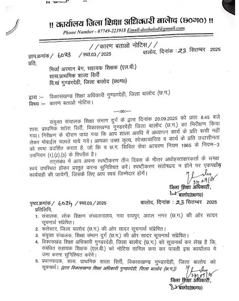बालोद। गुंडरदेही विकासखंड के सिर्री गांव स्थित प्राथमिक स्कूल में आकस्मिक निरीक्षण के दौरान दो शिक्षक मोबाइल का उपयोग करते पाए गए। इस पर संयुक्त संचालक शिक्षा, दुर्ग संभाग ने कड़ी कार्रवाई करते हुए सहायक शिक्षक (एलबी) विनय कुमार गोस्वामी को निलंबित कर दिया। वहीं सहायक शिक्षक मिर्जा अरमान बेग को कारण बताओ नोटिस जारी किया गया है।