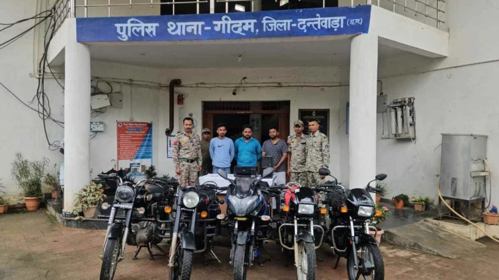 दंतेवाड़ा। चोरी की मोटरसाइकिलों को फर्जी दस्तावेजों के जरिए बेचने वाले गिरोह का भंडाफोड़ गीदम पुलिस ने किया है। इस मामले में तीन आरोपियों गुलशन नाहटा, कैलाश निषाद और रिज्जू केजे को गिरफ्तार किया गया है। इनके कब्जे से कुल पांच मोटरसाइकिलें बरामद की गई हैं, जिनमें दो बुलेट, दो स्प्लेंडर और एक पल्सर शामिल हैं।