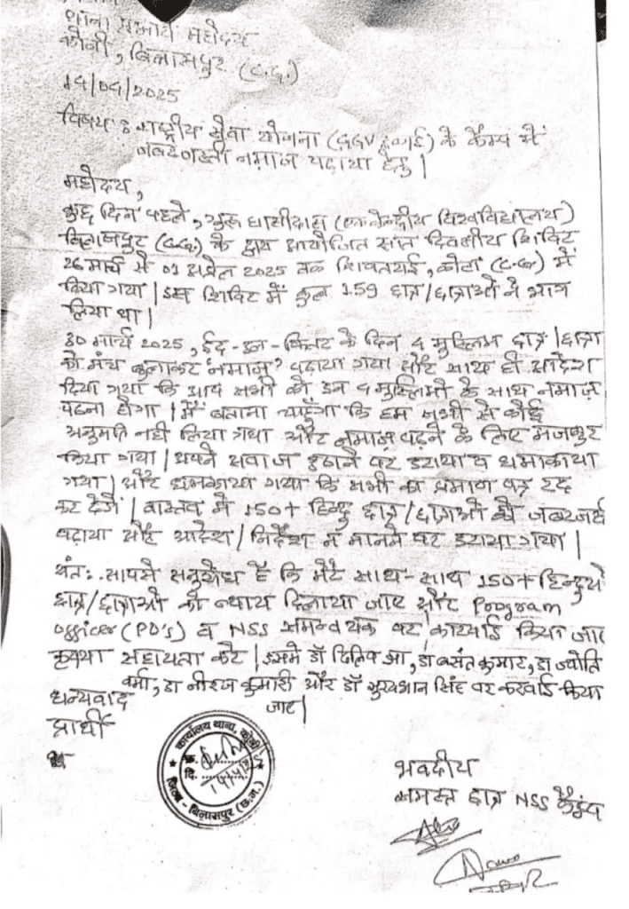 छत्तीसगढ़ के बिलासपुर स्थित गुरु घासीदास विश्वविद्यालय में एक विवादास्पद मामला सामने आया है, जहां हिंदू छात्रों ने आरोप लगाया है कि उन्हें एनएसएस कैंप के दौरान जबरदस्ती नमाज पढ़ने के लिए मजबूर किया गया। इस घटना को लेकर छात्रों ने कोनी थाना में एनएसएस कोऑर्डिनेटर और प्रोग्राम ऑफिसर के खिलाफ शिकायत दर्ज कराई है।