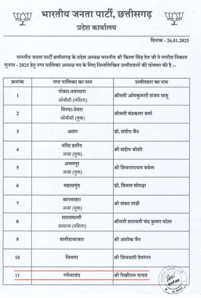 प्रदेश भाजपा अध्यक्ष किरण सिंहदेव ने अपने आधिकारिक अकाउंट से उम्मीदवारों की नई सूची जारी की, जिसमें यह बदलाव स्पष्ट हुआ। इस निर्णय के बाद पार्टी कार्यकर्ताओं और राजनीतिक हलकों में चर्चाएं तेज हो गई हैं।