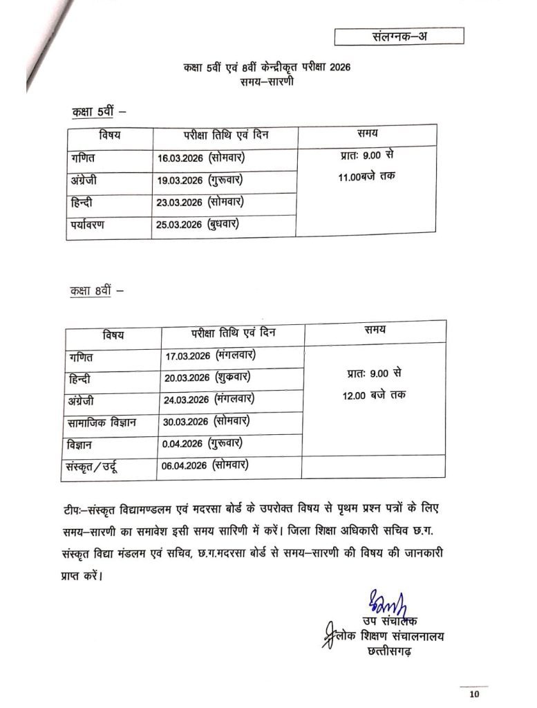 CG Exam Schedule Released : रायपुर। छत्तीसगढ़ लोक शिक्षा संचालनालय ने कक्षा 5वीं और 8वीं की वार्षिक परीक्षाओं की समय सारिणी जारी कर दी है। इस वर्ष परीक्षाएं बोर्ड पैटर्न पर आयोजित की जाएंगी। जारी कार्यक्रम के अनुसार कक्षा 5वीं की वार्षिक परीक्षा 16 मार्च से और कक्षा 8वीं की परीक्षा 17 मार्च से शुरू होगी। दोनों कक्षाओं की परीक्षाएं सुबह 9 बजे से प्रारंभ होंगी। हालांकि CBSE और ICSE स्कूलों के छात्र इन परीक्षाओं में शामिल नहीं होंगे। इस संबंध में जिला शिक्षा अधिकारियों को आवश्यक निर्देश जारी कर दिए गए हैं।