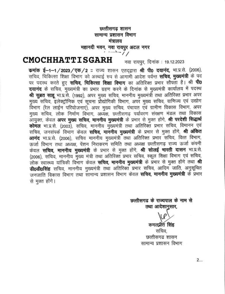 CG IAS Transfer: रायपुर। पी दयानंद मुख्यमंत्री के सचिव होंगे। जीएडी ने इस संबंध में आदेश जारी कर दिया है। बता दें कि 2006 बैच के IAS पी दयानंद के सचिव मुख्यमंत्री बनते ही एसीएस सुब्रत साहू, परदेशी सिद्धार्थ कोमल, अंकित आनंद, सोलई भारती दासन और डीडी सिंह को मुख्यमंत्री सचिवालय से मुक्त कर दिया है। पी दयांदन को मुख्यमंत्री के सचिव के साथ-साथ अतिरिक्त प्रभार के रूप में चिकित्सा शिक्षा विभाग की जिम्मेदारी भी दी गई है।