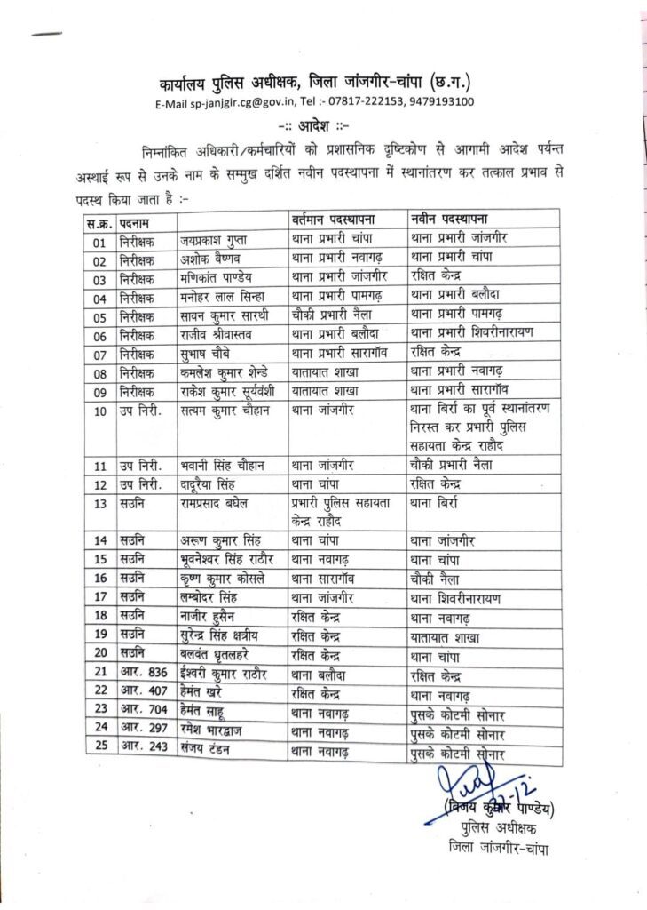 जांजगीर-चांपा। नए साल से पहले जिले के पुलिस विभाग में बड़ा प्रशासनिक फेरबदल किया गया है। एसपी विजय कुमार पाण्डेय ने तबादला आदेश जारी करते हुए कई अधिकारियों और कर्मचारियों की नई पदस्थापना की है।