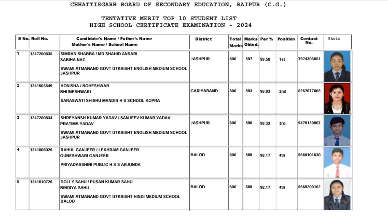 CG BOARD RESULT : छत्तीसगढ़ में कक्षा 10वीं और 12वीं के रिजल्ट जारी हो चुके हैं। CGBSC ने स्टूडेंट्स के परीक्षा परिणाम जारी कर दिये हैं। 10 वीं में जशपुर के स्वामी आत्मानंद की स्टूडेंट सिमरन शबा ने 99.50 प्रतिशत के साथ टॉप किया है। और 12 वीं में महासमुंद से महक अग्रवाल ने 97.40 प्रतिशत के साथ टॉप किया है।