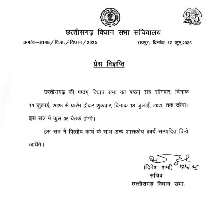 रायपुर। विधानसभा के मॉनसून सत्र के लिए अधिसूचना जारी कर दी गई है. 14 से 18 जुलाई तक चलने वाले सत्र में केवल 5 बैठकें होंगी, जिनमें वित्तीय और विधि विधायी कार्यों का निष्पादन होगा.