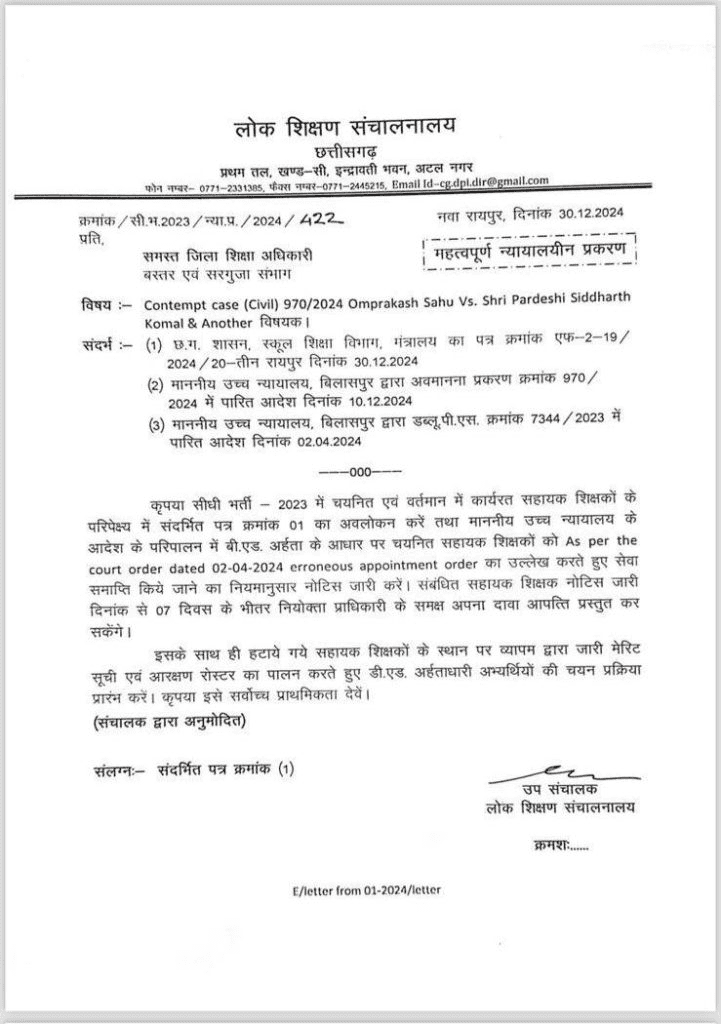 रायपुर। हाईकोर्ट और सुप्रीम कोर्ट के आदेश के तहत सहायक शिक्षक के 2855 पदों पर योग्य अभ्यर्थियों की नियुक्ति के निर्देश दिए गए थे। इन निर्देशों के अनुपालन में लोक शिक्षण संचालनालय ने बस्तर और सरगुजा संभाग के बीएड धारक सहायक शिक्षकों की सेवाएं समाप्त करने का आदेश जारी किया है। यह कार्रवाई हाईकोर्ट के निर्देशानुसार की गई है।