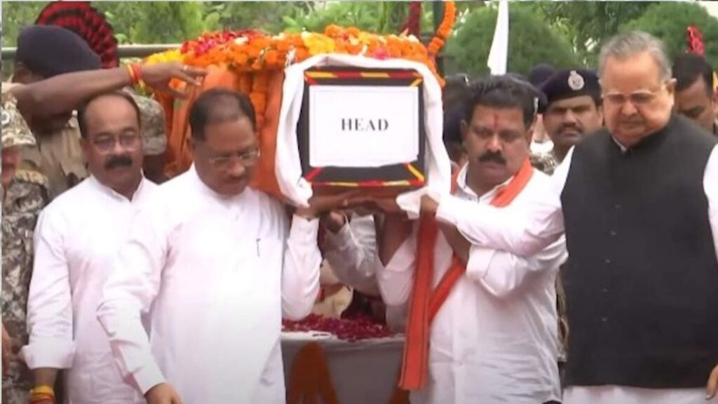 मुख्यमंत्री विष्णु देव साय, विधानसभा अध्यक्ष डॉ. रमन सिंह, उप मुख्यमंत्री विजय शर्मा और अरुण साव ने शहीद को पुष्पांजलि अर्पित की और पार्थिव शरीर को कांधा देकर अंतिम विदाई दी।