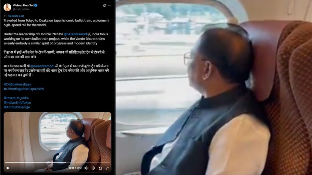 रायपुर। मुख्यमंत्री विष्णुदेव साय इन दिनों जापान और दक्षिण कोरिया के आधिकारिक दौरे पर हैं। इसी कड़ी में उन्होंने शुक्रवार को जापान की विश्व प्रसिद्ध बुलेट ट्रेन का अनुभव लिया। सीएम साय टोक्यो से ओसाका तक बुलेट ट्रेन से यात्रा करते नजर आए और इस यादगार सफर का वीडियो सोशल मीडिया पर साझा भी किया। उन्होंने कहा कि हाई-स्पीड रेल के क्षेत्र में जापान दुनिया का अग्रणी देश है और प्रधानमंत्री नरेंद्र मोदी के नेतृत्व में भारत भी बुलेट ट्रेन परियोजना पर तेजी से काम कर रहा है। वंदे भारत ट्रेन आज के आधुनिक भारत की नई पहचान बन चुकी है।