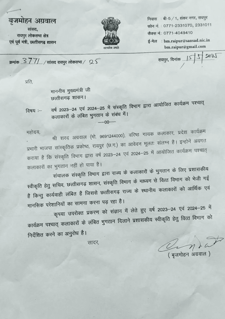 रायपुर। छत्तीसगढ़ के लोक कलाकारों के लिए राहत भरी खबर है। पिछले दो वित्तीय वर्षों 2023-24 और 2024-25 में आयोजित सांस्कृतिक कार्यक्रमों के बाद भी मानदेय का भुगतान न मिलने से परेशान कलाकारों की आवाज अब रायपुर सांसद और पूर्व संस्कृति मंत्री बृजमोहन अग्रवाल ने उठाई है। उन्होंने इस मुद्दे को गंभीर मानते हुए मुख्यमंत्री को पत्र लिखकर कलाकारों का भुगतान शीघ्र कराने की मांग की है।
