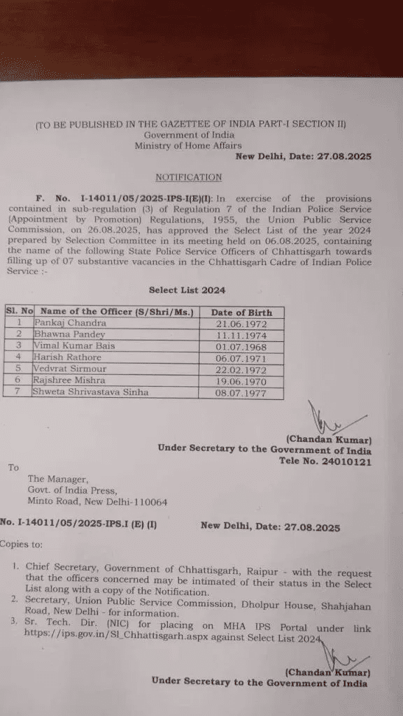 छत्तीसगढ़ पुलिस सेवा के सात अधिकारी बने IPS