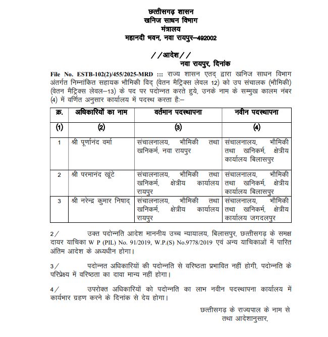 CG Promotion News: खनिज संसाधन विभाग में तीन सहायक भौमिकी विद उप संचालक पद पर पदोन्नत