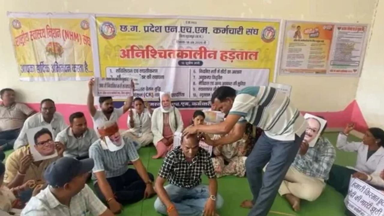 सूरजपुर। छत्तीसगढ़ में राष्ट्रीय स्वास्थ्य मिशन (NHM) के 16,000 से अधिक संविदा स्वास्थ्य कर्मचारी 18 अगस्त से अपनी 10 सूत्रीय मांगों को लेकर अनिश्चितकालीन हड़ताल पर हैं। सरकार की अनदेखी से नाराज कर्मचारियों का विरोध आज 11वें दिन भी जारी है। सूरजपुर बस स्टैंड के पास कर्मचारियों ने नियमितीकरण समेत अपनी मांगों को लेकर सिर मुंडवा कर प्रदर्शन किया।