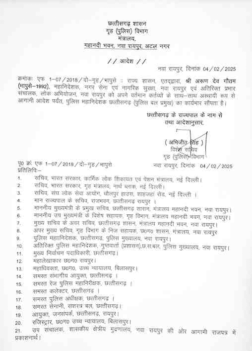 रायपुर। 1992 बैच के आईपीएस अधिकारी अरुण देव गौतम को छत्तीसगढ़ पुलिस के डीजीपी का प्रभार सौंपा गया है। वे पूर्णकालिक डीजीपी की नियुक्ति तक प्रदेश के पुलिस प्रमुख के रूप में कार्यभार संभालेंगे। डीजीपी अशोक जुनेजा के सेवानिवृत्त होने के बाद यह जिम्मेदारी उन्हें सौंपी गई है।