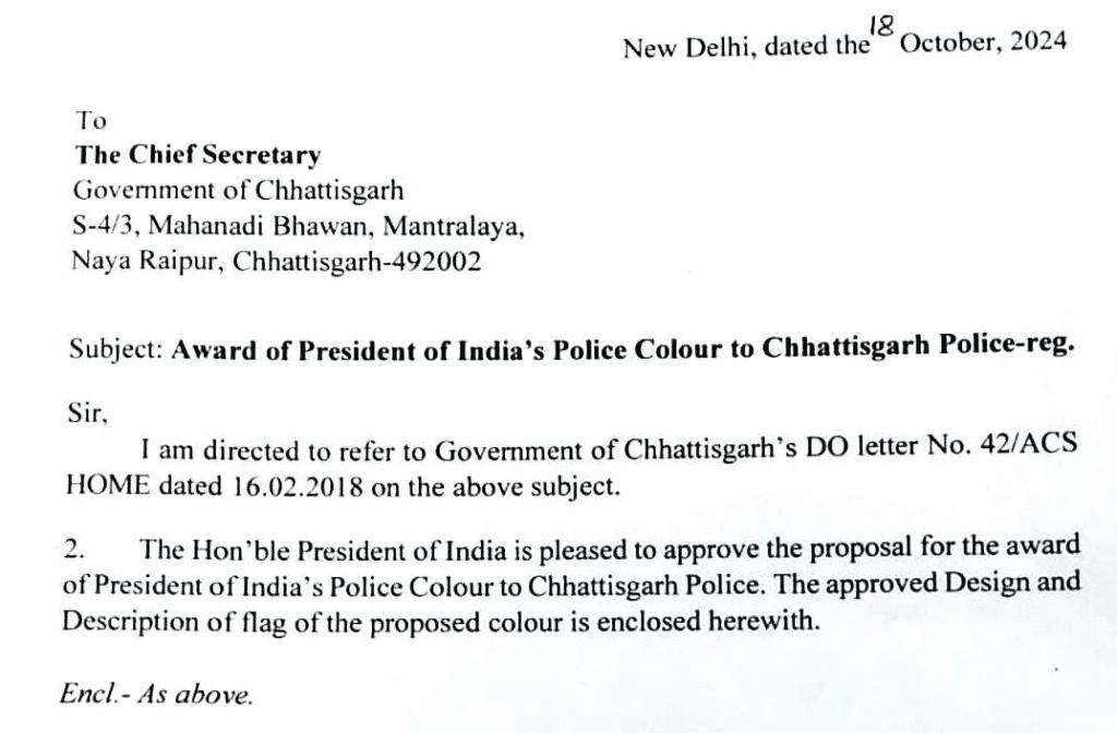 छत्तीसगढ़ सरकार ने 16 फरवरी 2018 को गृह विभाग के माध्यम से इस ध्वज के लिए प्रस्ताव भेजा था, जिसे अब स्वीकृति मिल चुकी है। इस सम्मान के साथ, पुलिस बल के जवान अब इस ध्वज की प्रतिकृति को अपनी वर्दी पर प्रतीक चिन्ह के रूप में धारण करेंगे, जो उनके शौर्य और सेवा का प्रतीक बनेगा।