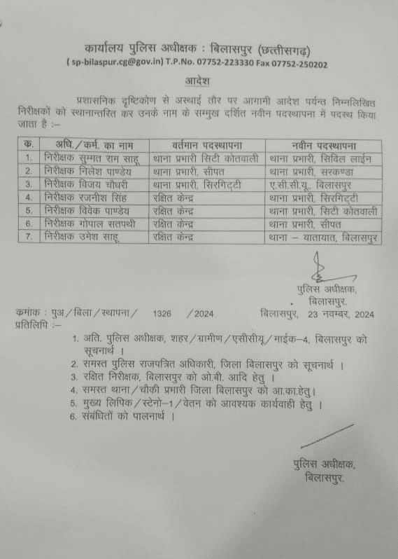 CG Police Transfer: जिले की पुलिसिंग में कसावट लाने के लिए पुलिस विभाग में बड़ा फेरबदल हुआ है। एसपी रजनेश सिंह ने सात निरीक्षकों के तबादले का आदेश जारी किया। इस तबादले में सिविल लाइन, सिरगिट्टी और सरकंडा थानों के प्रभारी प्रभावित हुए हैं।