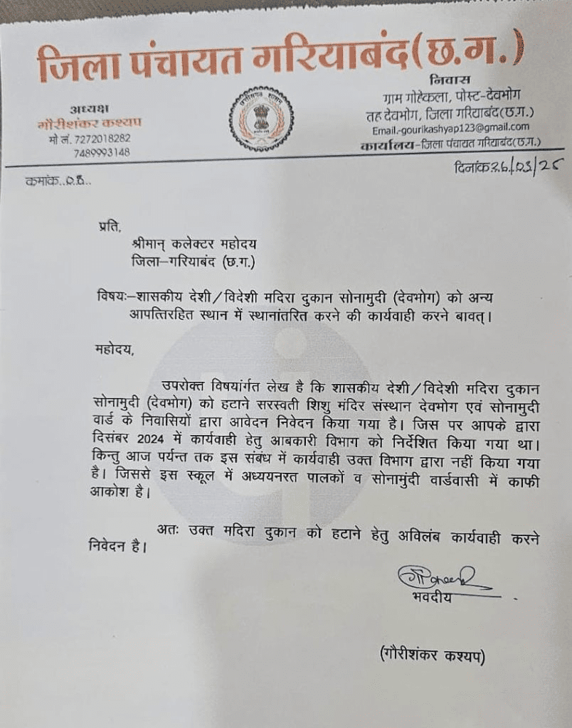 गरियाबंद। छत्तीसगढ़ के गरियाबंद जिले में सुशासन तिहार के तहत लगे समाधान शिविर के दौरान ग्राम सोनामुंदी में शराब दुकान हटाने की मांग जोर पकड़ती जा रही है। वार्ड पार्षद विनोद पांडे ने शिकायत करते हुए कहा कि वह इस संबंध में पांच बार से अधिक आवेदन दे चुके हैं, लेकिन विभागीय उदासीनता के चलते अब तक कोई ठोस कार्रवाई नहीं हुई है।