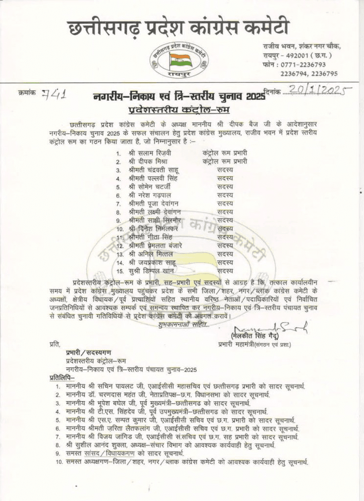 रायपुर। नगरीय निकाय और त्रिस्तरीय पंचायत चुनाव को ध्यान में रखते हुए छत्तीसगढ़ कांग्रेस ने प्रदेश स्तरीय कंट्रोल रूम का गठन किया है। इस कंट्रोल रूम में 15 सदस्यों की टीम बनाई गई है, जिसका नेतृत्व सलीम रिज़वी और दीपक मिश्रा करेंगे।