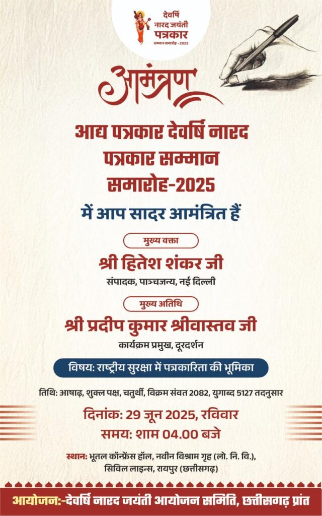 रायपुर। देवर्षि नारद जयंती के अवसर पर छत्तीसगढ़ प्रांत की आयोजन समिति द्वारा पत्रकारिता सम्मान समारोह का आयोजन किया जा रहा है। यह कार्यक्रम 29 जून 2025 को शाम 4 बजे रायपुर स्थित नवीन विश्राम गृह (लो.नि.वि.), भू-तल कांफ्रेंस हॉल, सिविल लाइन में संपन्न होगा।