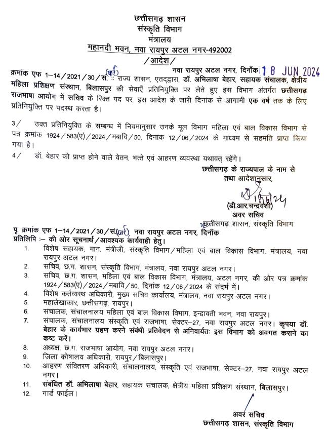 छत्तीसगढ़ शासन ने डॉ. अभिलाषा बेहार को छत्तीसगढ़ी राजभाषा आयोग का सचिव नियुक्त किया है। उन्हें अगले एक साल की अवधि के लिए इस पद पर प्रतिनियुक्ति दी गई है।