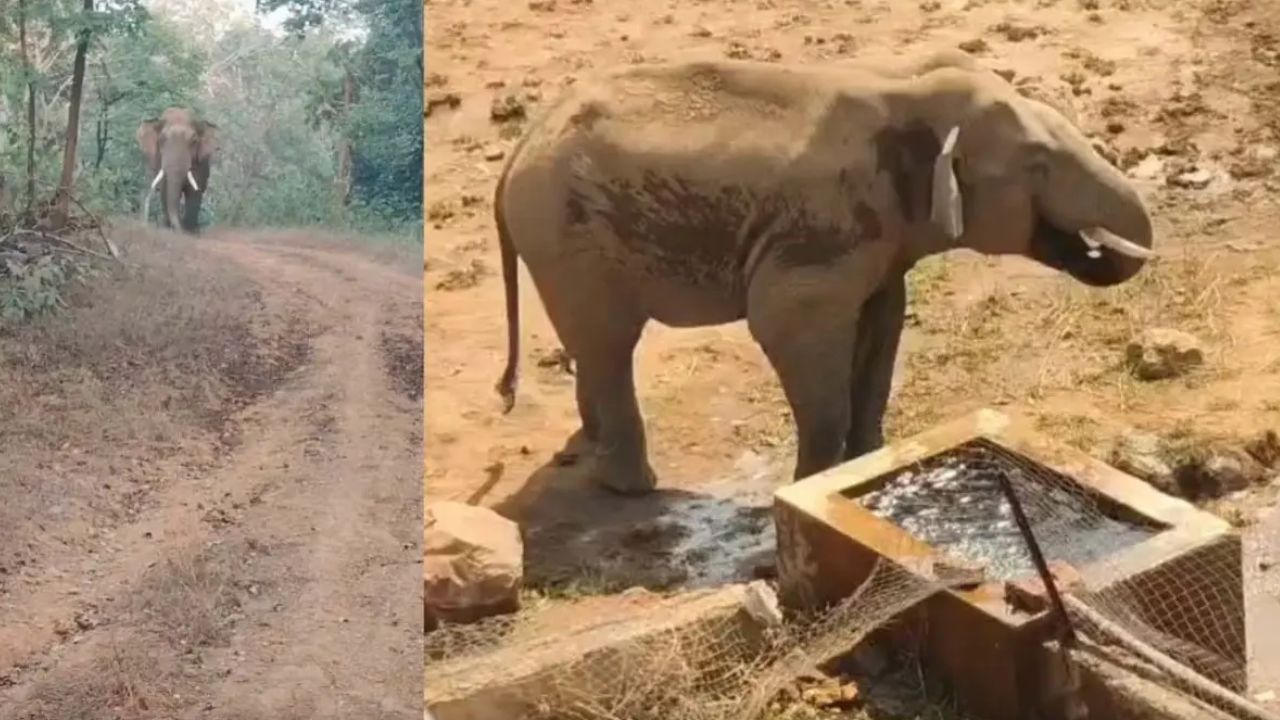 वीडियो में देखा जा सकता है कि एक बड़ा हाथी तालाब में सिर नीचे और पैर ऊपर करके मस्ती से नहा रहा है, वहीं दूसरा वीडियो में एक हाथी का बच्चा पानी की टंकी से सूंढ़ से पानी पीता और खुद को ठंडा करता दिख रहा है।