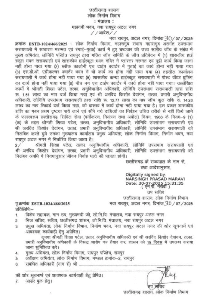 महासमुंद में पीडब्ल्यूडी में बड़ा भ्रष्टाचार, मरम्मत कार्य दिखाकर 14.28 लाख की हेराफेरी, दो अधिकारी निलंबित