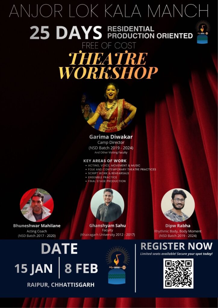 रायपुर। अंजोर लोक कला मंच, रायपुर द्वारा 15 जनवरी से 8 फरवरी तक 25 दिवसीय निःशुल्क, आवासीय एवं प्रोडक्शन-आधारित रंगमंच कार्यशाला का आयोजन किया जा रहा है। यह कार्यशाला रंगमंच में रुचि रखने वाले चयनित प्रतिभागियों को प्रशिक्षण से लेकर अंतिम नाट्य प्रस्तुति तक की संपूर्ण निर्माण प्रक्रिया से जोड़ने के उद्देश्य से आयोजित की जा रही है।