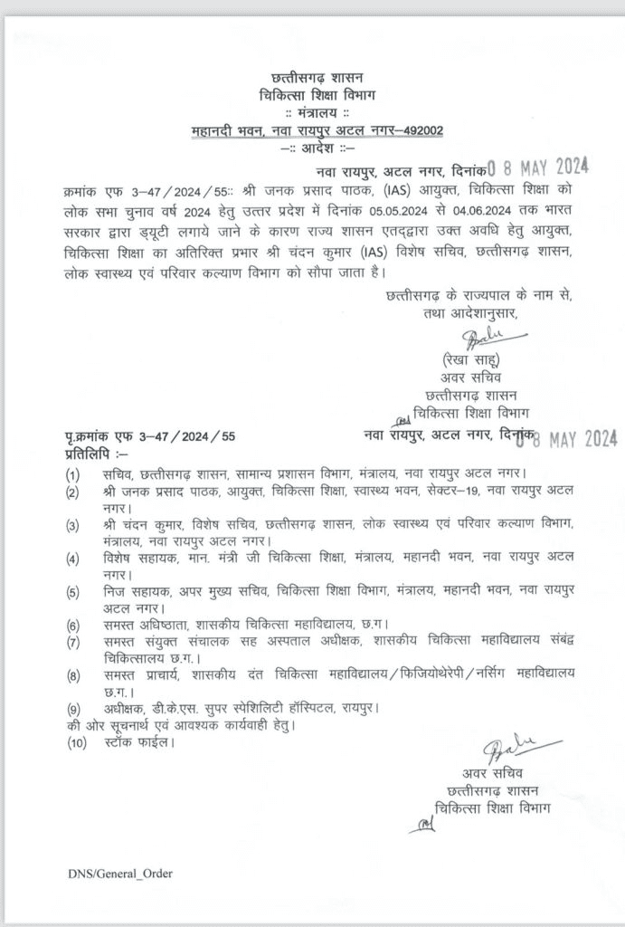रायपुर। छत्तीसगढ़ शासन ने लोक स्वास्थ्य एवं परिवार कल्याण विभाग के विशेष सचिव IAS चंदन कुमार को आयुक्त, चिकित्सा शिक्षा का अतिरिक्त प्रभार सौंपा गया है. बता दें कि भारत सरकार ने IAS जनक प्रसाद पाठक आयुक्त, चिकित्सा शिक्षा की ड्यूटी उत्तर प्रदेश में 5 मई 2024 से 4 जून 2024 तक लोकसभा चुनाव के मद्देनजर लगाई है. जिसके चलते राज्य शासन ने IAS चंदन कुमार को यह जिम्मेदारी सौंपी है.