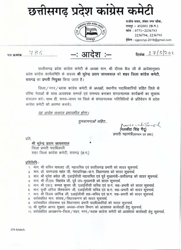 यह नियुक्ति तत्काल प्रभाव से लागू कर दी गई है। आदेश पर कांग्रेस के प्रभारी महामंत्री (संगठन एवं प्रशासन) मलकीत सिंह गैदू के हस्ताक्षर हैं। नियुक्ति पत्र के साथ जायसवाल को नई जिम्मेदारी के लिए शुभकामनाएं भी दी गई हैं।