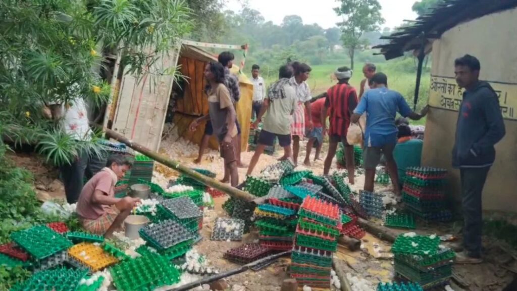 जशपुर : जशपुर जिले के बागबहार थाना क्षेत्र में उस समय अफरा-तफरी मच गई, जब अंडों से लदी एक तेज रफ्तार पिकअप कुकरगांव के पास पलट गई। हादसे के बाद सड़क पर अंडे बिखर गए और ग्रामीणों की भीड़ मौके पर टूट पड़ी। हर कोई जितना अंडा समेट सकता था, उतना समेटने में जुट गया।