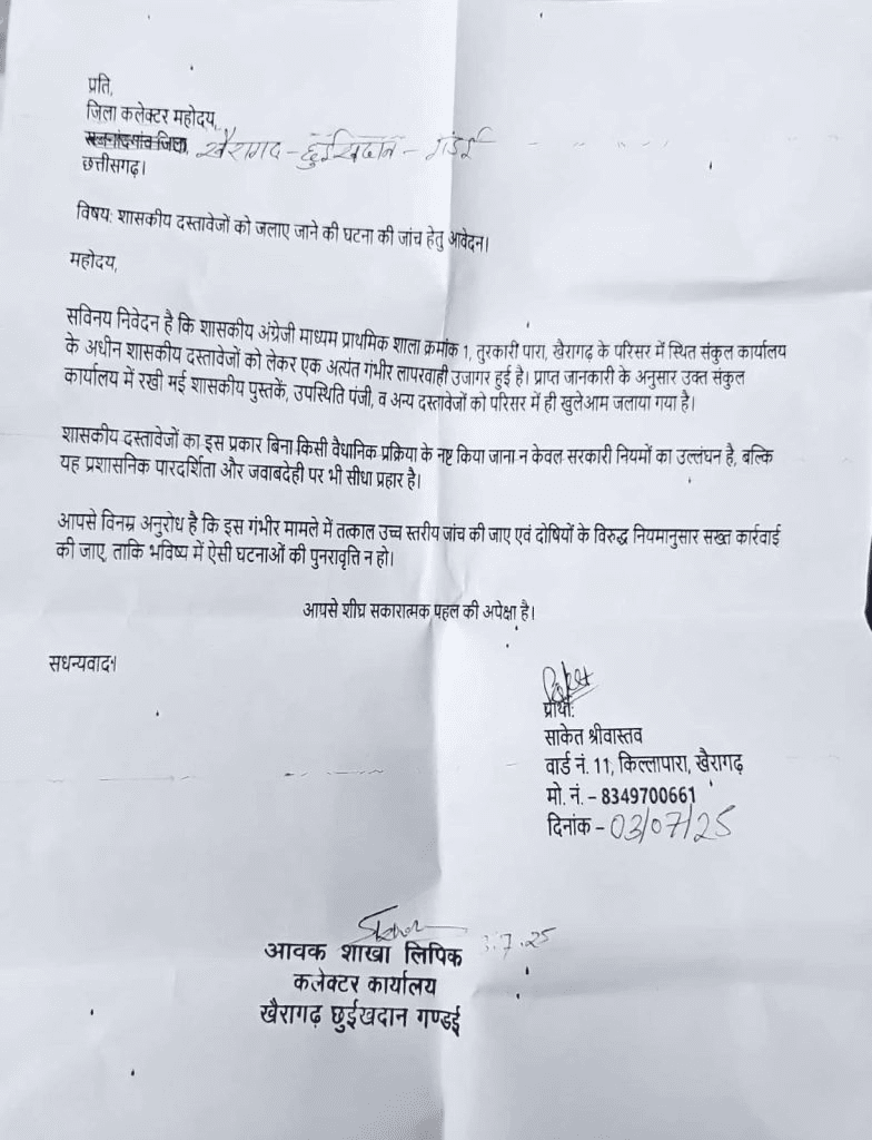 खैरागढ़। छत्तीसगढ़ के खैरागढ़ स्थित शासकीय अंग्रेजी माध्यम प्राथमिक शाला (क्रमांक-1) में गंभीर लापरवाही का मामला सामने आया है। स्कूल प्रशासन द्वारा किताबें, रजिस्टर और सरकारी दस्तावेजों को बिना किसी आधिकारिक प्रक्रिया के आग के हवाले कर दिया गया, जिससे क्षेत्र में हड़कंप मच गया है।