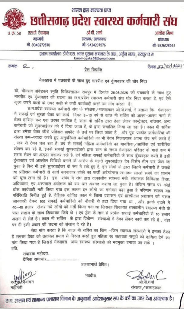 रायपुर। राज्य के सबसे बड़े सरकारी अस्पताल मेकाहारा सहित अन्य सरकारी संस्थानों में सफाई सेवाएं देने वाली “कॉल मी सर्विस” कंपनी एक बार फिर विवादों के घेरे में है। छत्तीसगढ़ प्रदेश स्वास्थ्य कर्मचारी संघ ने कंपनी पर महिला सफाई कर्मचारियों के मानसिक, आर्थिक और शारीरिक शोषण, फर्जी उपस्थिति, अवैध वसूली और अस्पताल परिसर में शराब सेवन जैसे गंभीर आरोप लगाए हैं। संघ ने इन मामलों को लेकर राज्य सरकार को पत्र लिखते हुए त्वरित और सख्त कार्रवाई की मांग की है।
