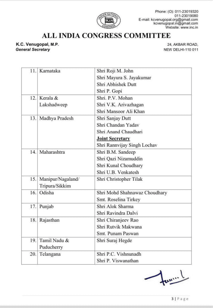 रायपुर: अखिल भारतीय कांग्रेस कमेटी ने छत्तीसगढ़ समेत कई राज्यों में संगठनात्मक ढांचे में बड़ा बदलाव करते हुए नए सचिव और संयुक्त सचिव नियुक्त किए हैं। इस फेरबदल में छत्तीसगढ़ में संपत कुमार और जारिता लैतफलांग को सचिव और विजय जांगिड़ को संयुक्त सचिव की जिम्मेदारी सौंपी गई है। पार्टी ने चंदन यादव और सप्तगिरी उल्का के स्थान पर इन नए नेताओं को नियुक्त किया है।