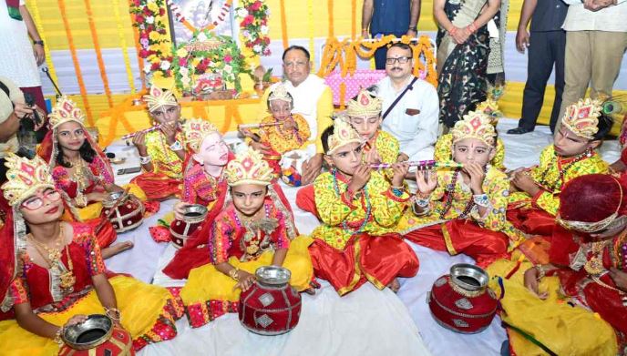 रायपुर। कृष्ण जन्माष्टमी के पावन अवसर पर मुख्यमंत्री निवास में भगवान श्रीकृष्ण का जन्मोत्सव हर्षोल्लास के साथ मनाया गया। इस वर्ष मुख्यमंत्री विष्णु देव साय ने जन्माष्टमी का त्योहार अपने निवास पर विशेष रूप से दिव्यांग बच्चों के साथ मनाया, जो इस आयोजन की खासियत रही। रायपुर की तीन दिव्यांग संस्थाओं के 25 बच्चे, जिन्होंने राधा और कृष्ण का रूप धरा था, अपनी अठखेलियों से मुख्यमंत्री निवास को आनंदमय बना दिया।