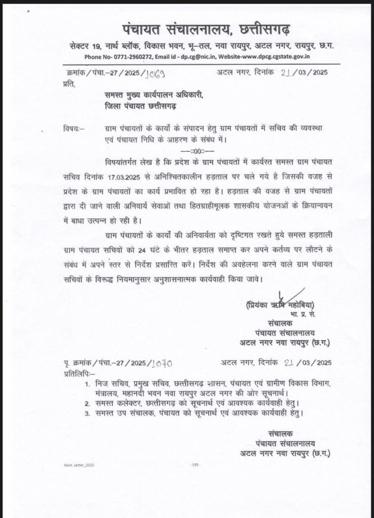 रायपुर। पंचायत संचालनालय के निदेशक ने प्रदेश के सभी जिला पंचायतों के मुख्य कार्यपालन अधिकारियों को पत्र जारी कर हड़ताली ग्राम पंचायत सचिवों को 24 घंटे के भीतर ड्यूटी पर लौटने का अल्टीमेटम दिया है। उन्होंने स्पष्ट निर्देश दिए हैं कि सचिवों को कर्तव्यों पर लौटने के लिए तत्काल आदेश जारी करें।