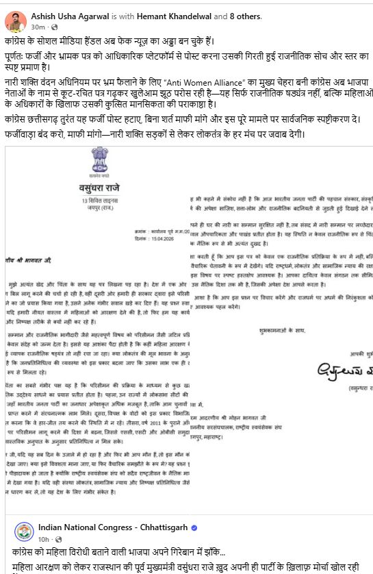 आशीष अग्रवाल ने यह भी कहा कि नारी शक्ति वंदन अधिनियम को लेकर भ्रम फैलाने की कोशिश की जा रही है। उनके मुताबिक, कांग्रेस भाजपा नेताओं के नाम से फर्जी पत्र तैयार कर जनता को गुमराह कर रही है, जो न केवल राजनीतिक साजिश है बल्कि महिलाओं के अधिकारों के खिलाफ भी है।