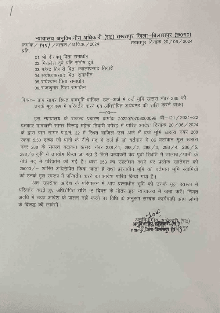 इसके बाद एसडीएम ने भू राजस्व संहिता की धारा 242 और 253 की शक्तियों का उपयोग करते हुए 6 लोगों पर 25-25 हजार रुपये अर्थदंड सहित तालाब की भूमि को फिर से तालाब के स्वरूप में परिवर्तित करने का आदेश जारी किया है।