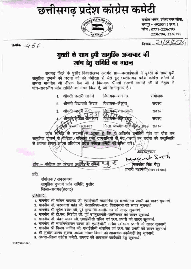 रायगढ़: छत्तीसगढ़ के रायगढ़ जिले में हुई एक युवती के साथ सामूहिक दुष्कर्म की घटना ने पूरे क्षेत्र को हिलाकर रख दिया है। इस घटना की गंभीरता को देखते हुए कांग्रेस पार्टी ने एक 5 सदस्यीय जांच समिति का गठन किया है।