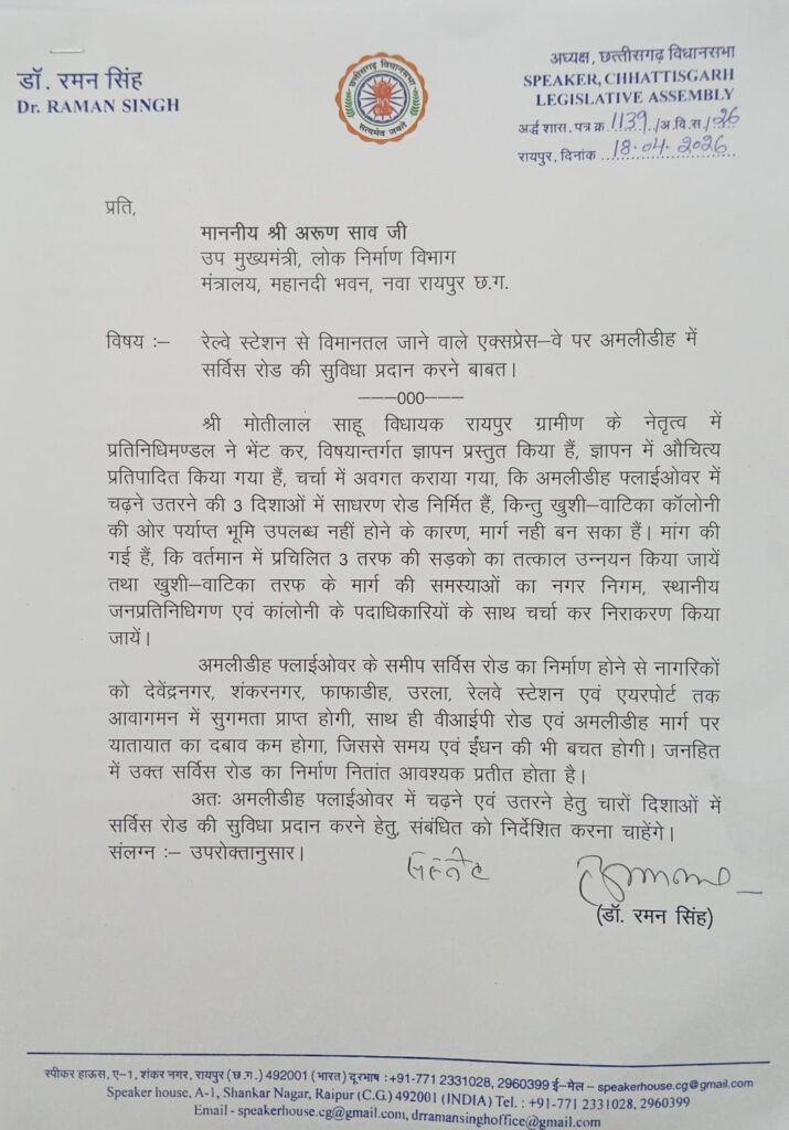 पत्र में उल्लेख किया गया है कि रायपुर ग्रामीण के विधायक मोतीलाल साहू के नेतृत्व में एक प्रतिनिधिमंडल ने उनसे मुलाकात कर ज्ञापन सौंपा। ज्ञापन में बताया गया कि अमलीडीह फ्लाईओवर पर चढ़ने और उतरने के लिए तीन दिशाओं में सामान्य सड़कें तो मौजूद हैं, लेकिन खुशी-वाटिका कॉलोनी की ओर पर्याप्त भूमि नहीं होने के कारण मार्ग का निर्माण अब तक नहीं हो सका है।