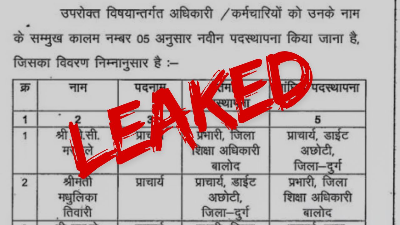 रायपुर। स्कूल शिक्षा विभाग में प्राचार्यों, व्याख्याताओं और शिक्षकों की बड़ी संख्या में प्रस्तावित प्रतिनियुक्ति और तबादलों की सूची सोशल मीडिया पर वायरल हो गई है। बताया जा रहा है कि यह सूची शिक्षा मंत्री गजेन्द्र यादव के अनुमोदन के बाद मुख्यमंत्री विष्णुदेव साय को भेजी गई थी। लेकिन मुख्यमंत्री की मंजूरी से पहले ही लिस्ट लीक हो जाने से विभाग की गोपनीयता पर गंभीर सवाल खड़े हो गए हैं।