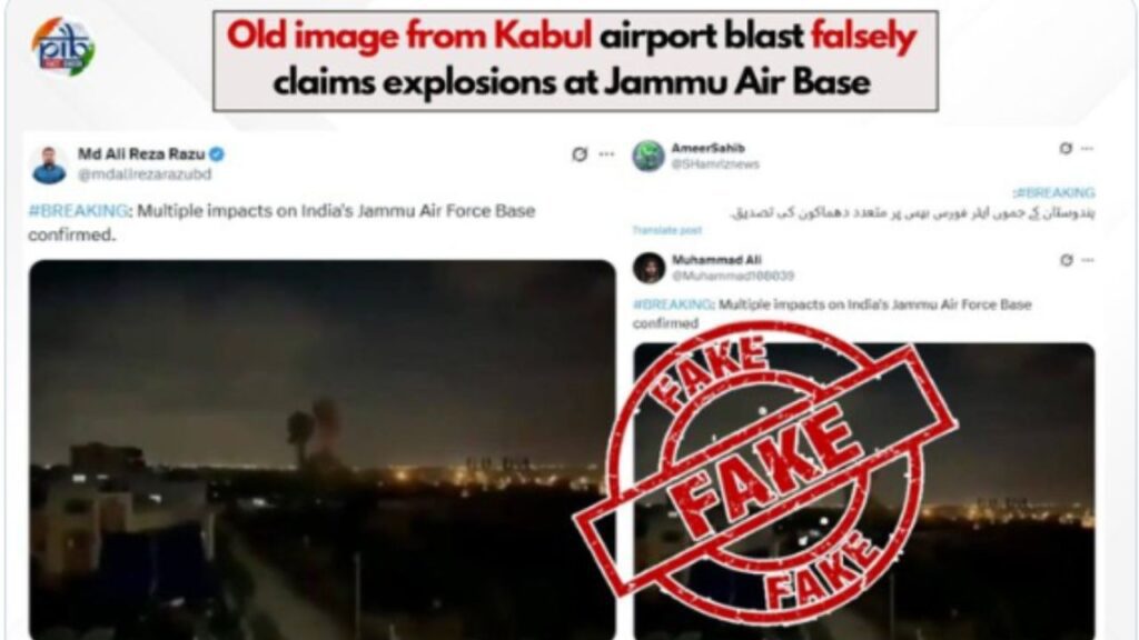 सोशल मीडिया पर वायरल हो रही खबरों में जम्मू एयरफोर्स बेस पर धमाकों का दावा किया गया है। इन दावों के साथ जो तस्वीरें साझा की जा रही हैं, वे झूठी हैंPIB Fact Check के मुताबिक, ये तस्वीरें वास्तव में अगस्त 2021 में काबुल एयरपोर्ट पर हुए धमाके की हैं, जिनका भारत से कोई लेना-देना नहीं है।