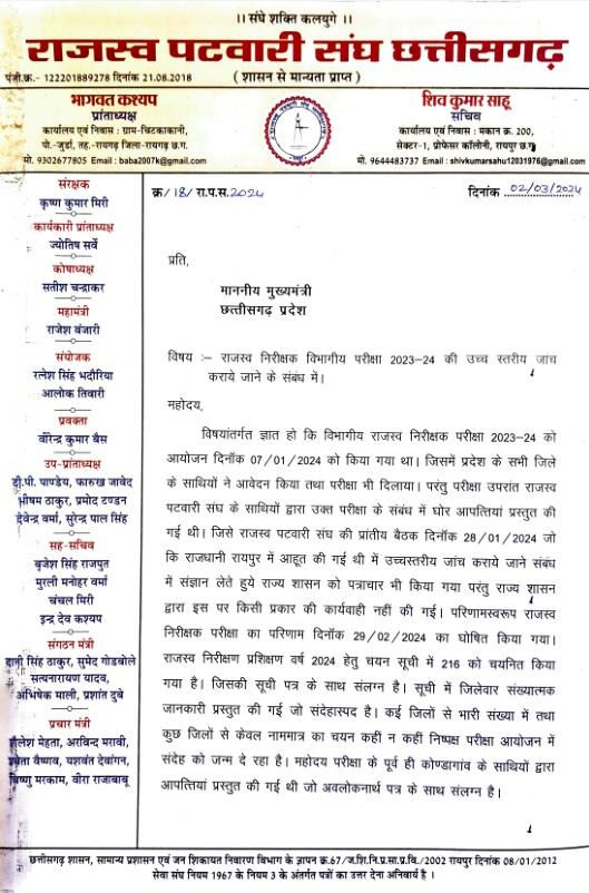 पत्र में कहा गया है कि  7 जनवरी को आयोजित राजस्व निरीक्षक परीक्षा पर आपत्ति जताते हुए संघ ने उच्चस्तरीय जांच के लिए राज्य शासन से पत्राचार किया था. लेकिन राज्य सरकार ने आपत्तियों पर किसी प्रकार की कार्रवाई करने की बजाए परीक्षा का परिणाम 29 फरवरी को घोषित किया दिया.