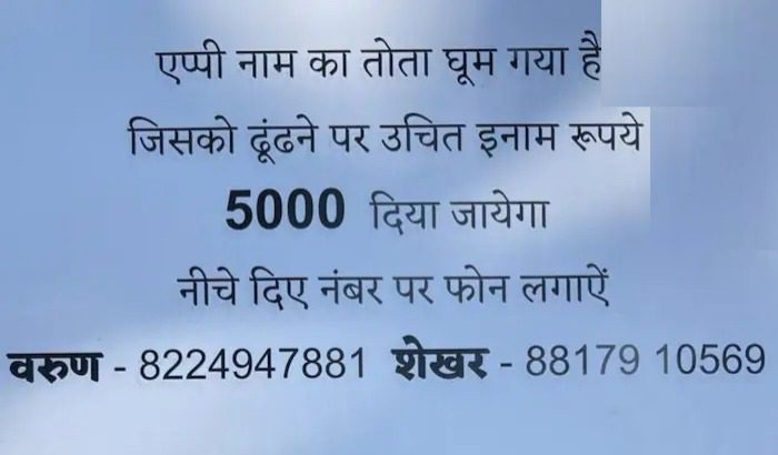 परिवार ने शहर के प्रमुख चौराहों पर होर्डिंग लगाए हैं, जिनमें तोते की तस्वीर और संपर्क जानकारी दी गई है। होर्डिंग में लिखा है, “एप्पी नाम का तोता घूम गया है, जिसको ढूंढने पर उचित इनाम रूपये 5000 दिया जायेगा”