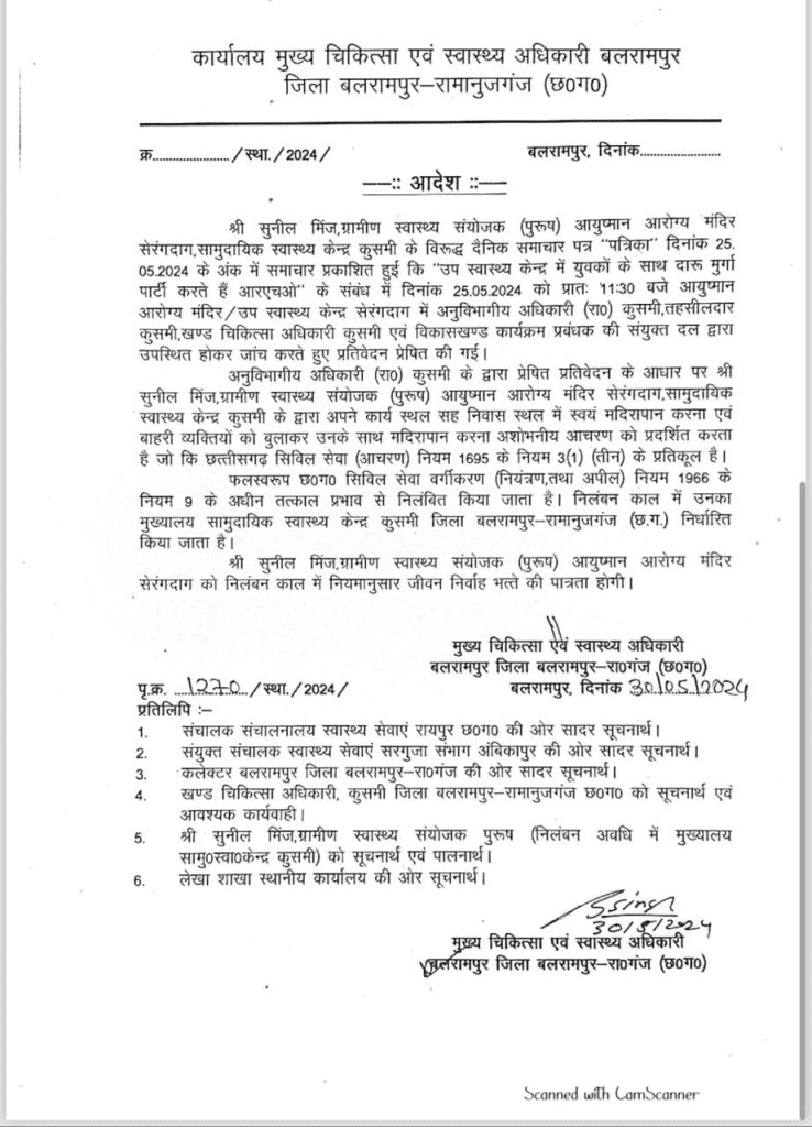 बलरामपुर के उप स्वास्थ्य केंद्र सेरंगदाग में शराब और चिकन पार्टी करने वाले RHO को निलंबित कर दिया गया है। सीएमएचओ डॉ. बसंत सिंह ने यह कार्रवाई की है।