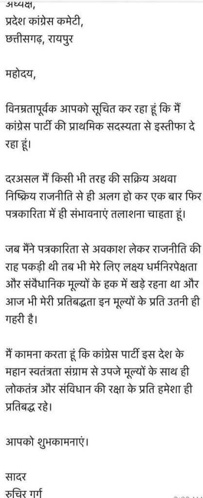 रुचिर गर्ग ने अपने पत्र में लिखा, “विनम्रतापूर्वक सूचित कर रहा हूं कि मैं कांग्रेस पार्टी की प्राथमिक सदस्यता से इस्तीफा दे रहा हूं। मैं किसी भी तरह की सक्रिय या निष्क्रिय राजनीति से अलग होकर फिर से पत्रकारिता में संभावनाएं तलाशना चाहता हूं।”